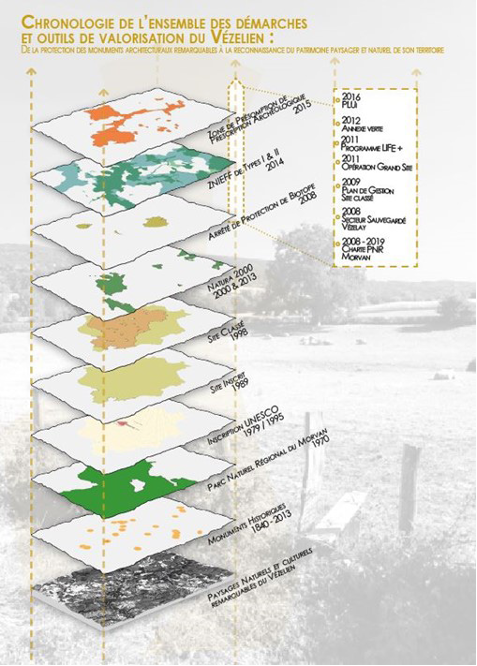 La qualité des patrimoines du Vézelien a valu au territoire d’être, très tôt, l’objet de protections mises en oeuvre au titre du Code du patrimoine, du Code de l’environnement ou encore, pour les productions locales, du Code Rural de la Pêche Maritime.