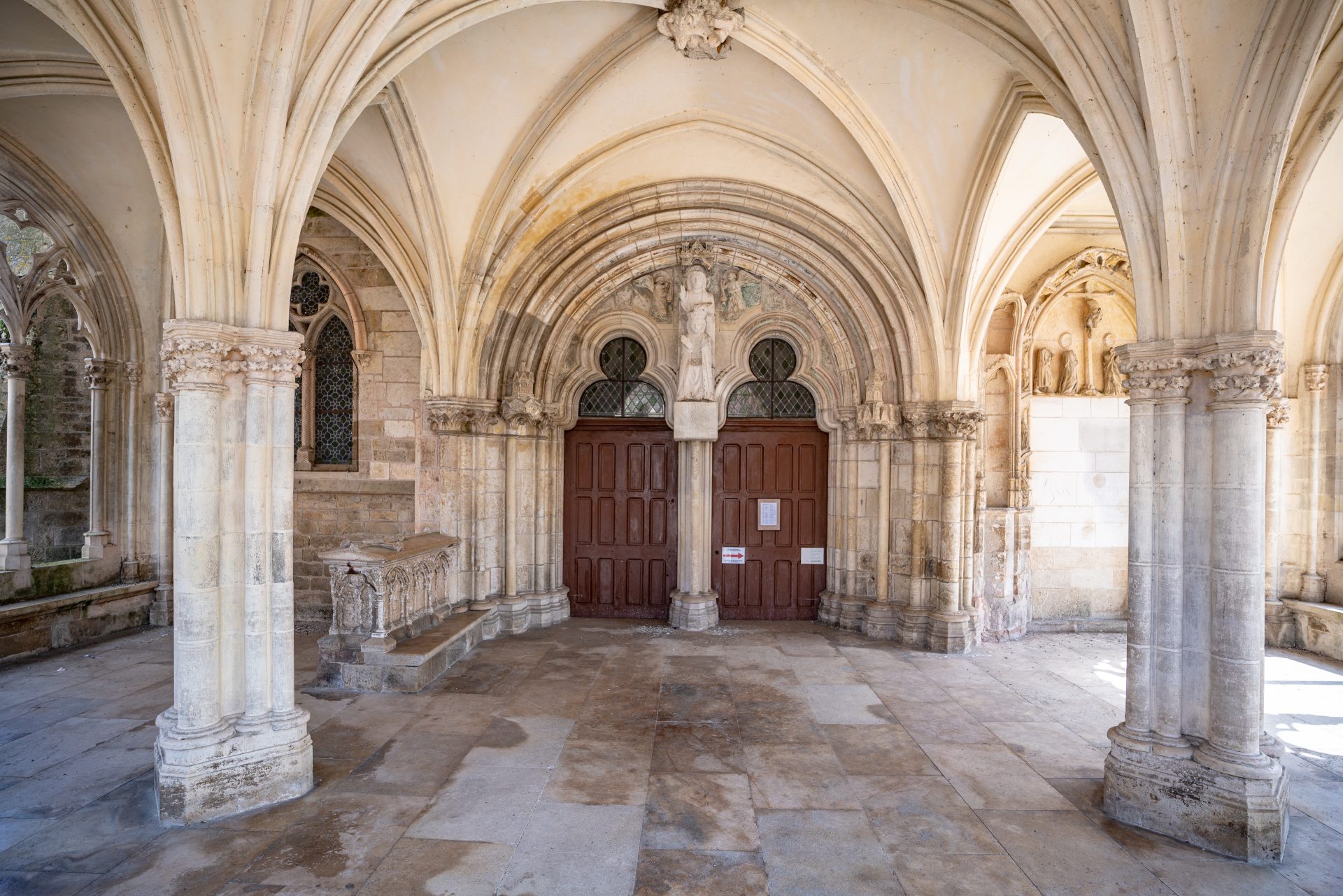 Sous le porche on peut voir, sculptés en ronde-bosse, une femme accompagnée d’un homme tenant une maquette d’église et les spécialistes admettent ce couple comme les fondateurs. Cet homme et cette femme, bien que très fortunés, n’étaient pas nobles et après leur disparition, l’église ne put jouir d’aucun revenu, comme le précise la curieuse inscription du portail trilobé central. Le porche abrite également un très beau tombeau de femme daté de 1258. C’est d’ailleurs le seul élément daté de l’église.